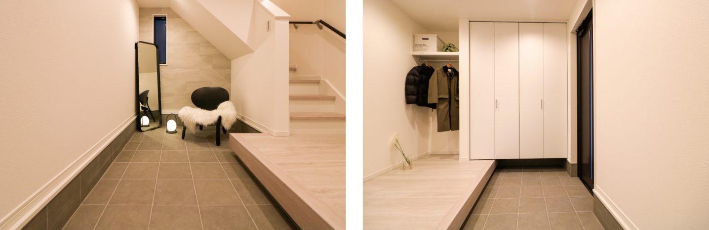 階段下を活用した約1.5畳の奥行がある玄関。チェアやミラーを置いてインテリアを楽しむことができます。