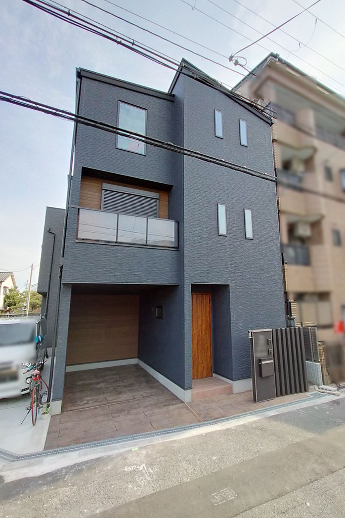 ネイビー×木目に、ブラックの窓枠でアクセントを加えたスタイリッシュな外観。