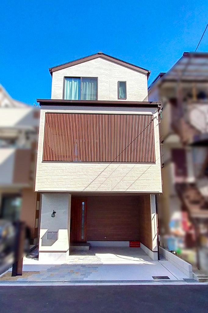 家事ラクをテーマに「水回りはとことんこだわりたい」というご要望から出来た、オリジナルの造作洗面台にトイレスペース。2階にはLDKの顔といっても過言ではない、こだわりの詰まったおしゃれな造作洗面台にアイアンの物干しバー、リビングの懸垂バーなど、遊び心を加えながら天井まで余すことなく計画しました。LDKは、ワイドサッシとバルコニーの手すりに格子を採用することで、プライバシーを確保しつつ、光と風を取り込む開放感ある空間に仕上がっています。