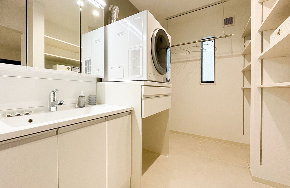 洗面室には、乾太くんやハンガーパイプがあり、お洗濯がラクラク◎