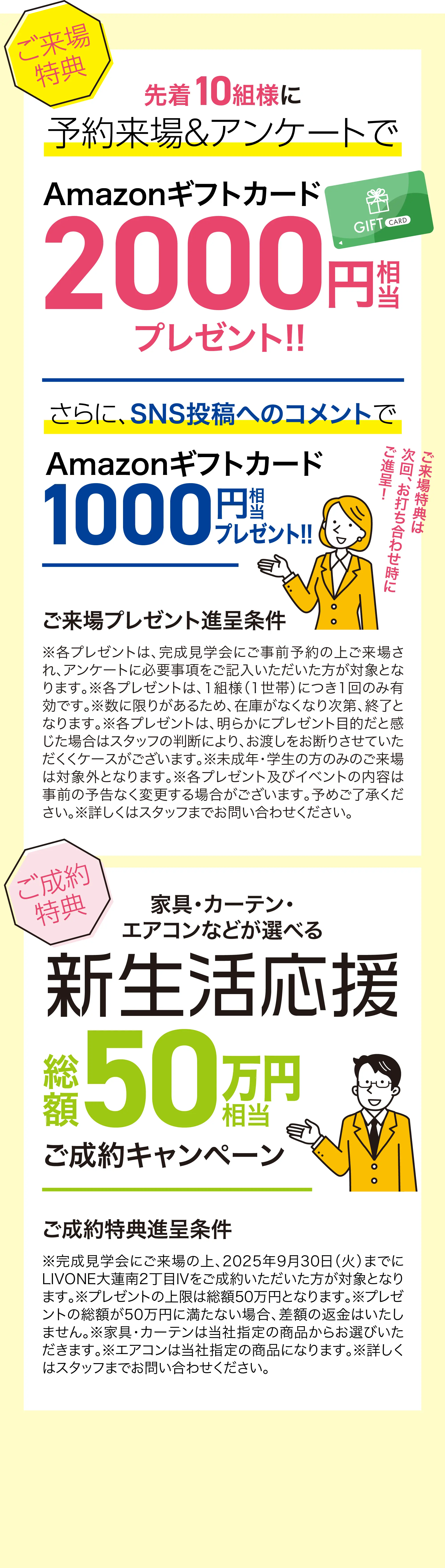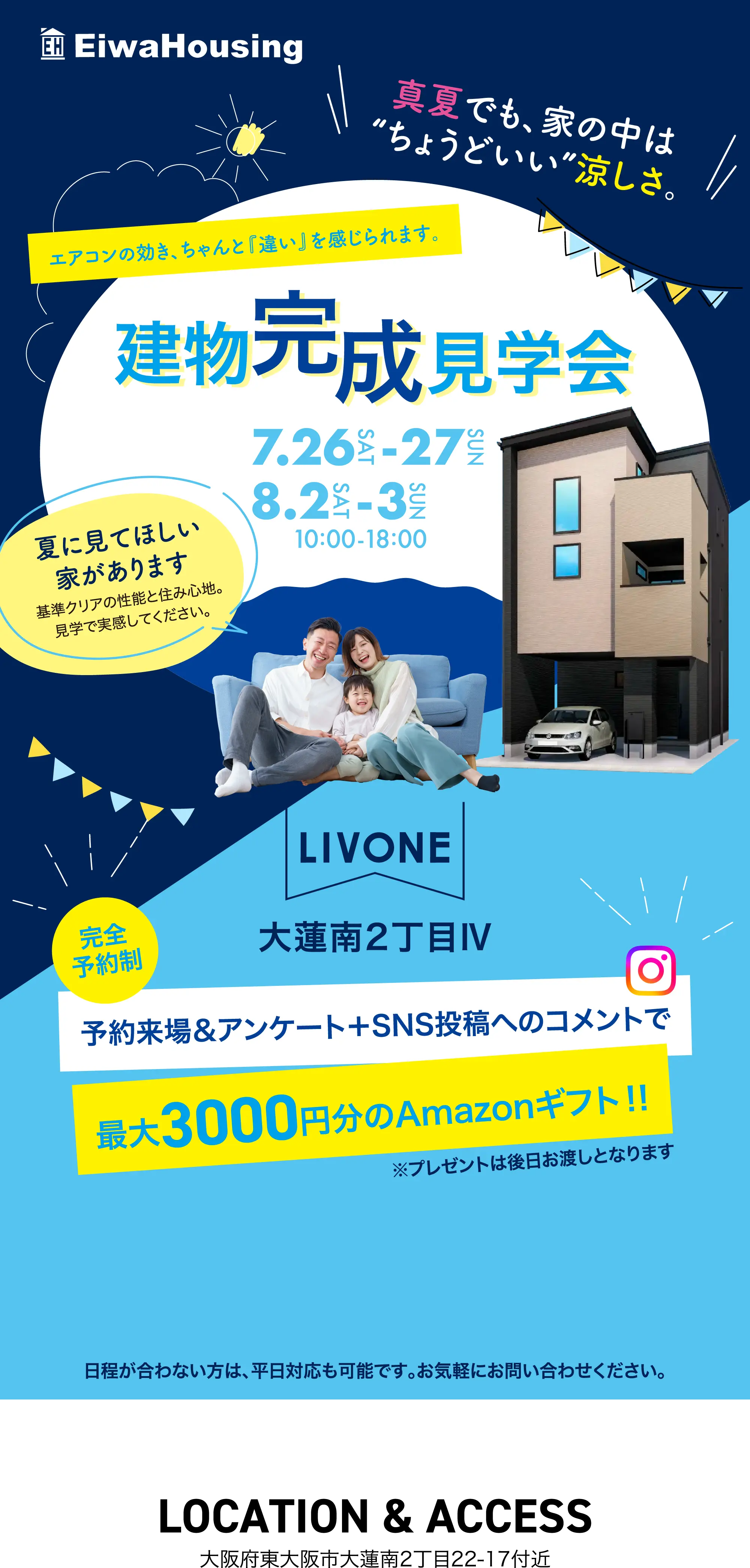 ■LIVONE大蓮南2丁目Ⅳ 物件概要●所在地/大阪府東大阪市大蓮南2丁目22-17付近●交通/近鉄大阪線「弥刀」駅自転車6分 (1320m~1400m)、JRおおさか東線「衣摺加美北」駅自転車7分(1580~1660m)、JR関西本線「加美」駅自転車8~9分 (1970~2050m)●総区画数/24区画●開発面積/2194.24㎡●土地面積/70.00㎡(約21.17坪)〜83.84㎡(約25.36坪)●用途地域/第一種住居地域●建ぺい率/60%●容積率/200%●地目/宅地●設備/公営水道、公共下水、都市ガス●道路/西側約4.8m、開発地内道路約5.7m●私道負担/なし●その他規制/準防火地域●取引形態/売主:株式会社エイワハウジング(所在地:大阪市都島区東野田町2丁目2番10号 都島住宅京橋ビル10階、宅建業許可番号:大阪府知事(6)第047208号、TEL:06-6356-9100)●情報公開日/2025年6月25日●次回更新予定日/2025年7月9日 ■建売住宅 分譲概要●今回販売戸数/9戸●販売価格/3490万円〜3850万円●土地面積/70.00㎡(約21.17坪)〜79.75㎡(約24.12坪)●延床面積/98.12㎡(約29.68坪)〜104.98㎡(約31.75坪)●建築確認番号/第総合24-0191号(2025年3月5日付)他●完成予定/2025年7月中旬より順次●引渡予定/2025年7月中旬より順次●構造・規模/木造軸組パネル工法3階建●間取り/2LDK+S・3LDK+S ■建築条件付売土地 分譲概要●今回販売区画数/10区画●販売価格/1610万円〜1910万円●最多販売価格帯/1600万円台(7区画)●土地面積/70.00㎡(約21.17坪)〜81.94㎡(約24.78坪)●引渡/相談※本物件の売主と買主は、土地の売買契約の締結後2カ月以内に建物の工事請負契約を締結する。この期日までに両者が工事請負契約の内容に合意できないときには、本契約は白紙解約することとし、売主が買主より受領済みの金銭は速やかに返還するものとする。
