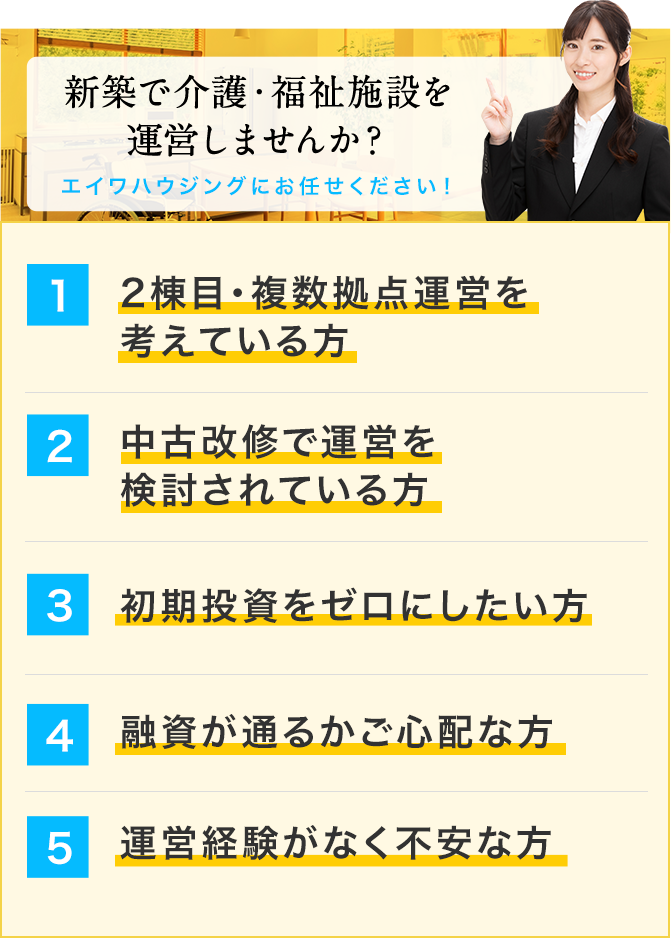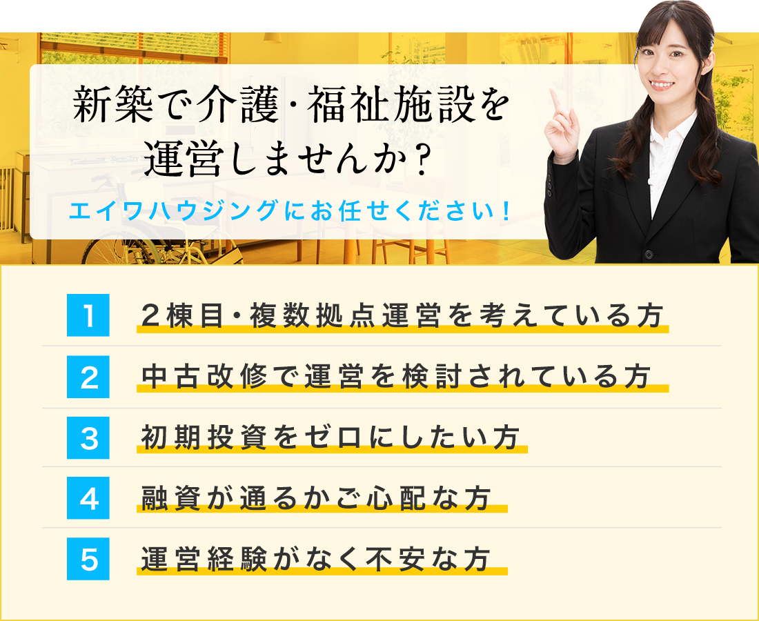 大阪市内で障がい者福祉施設・介護施設の運営をお考えの方は是非お気軽にご相談いただければと思います。 株式会社エイワハウジング