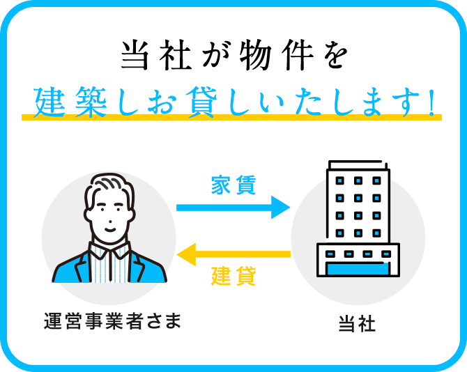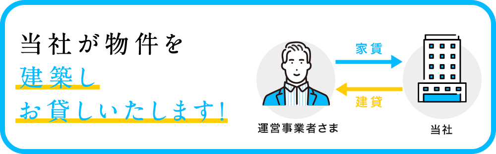 運営事業者様から運営希望エリアをお伺いして、弊社が土地を購入し施設を建築いたします。条件に合う土地探しや中古物件探しは不要です。大阪市の市場性を考慮した土地の選定から、事業者様が運営しやすい・利用者様が生活しやすい建物の提供をお約束します。