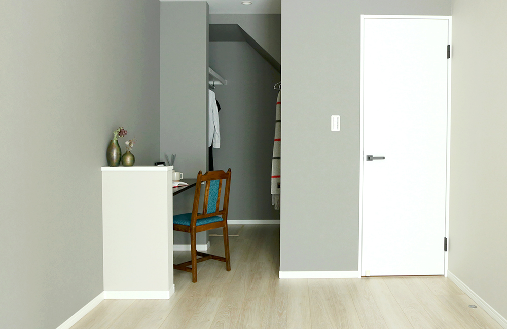1Fの主寝室には、移動のしやすいオープンタイプのウォークインクローゼットと、ドレッサーカウンターを設けました。外出前の服装やメイク・髪型などを、ワンコーナーでスムーズに整えられる、ママにうれしいスペースになっています。