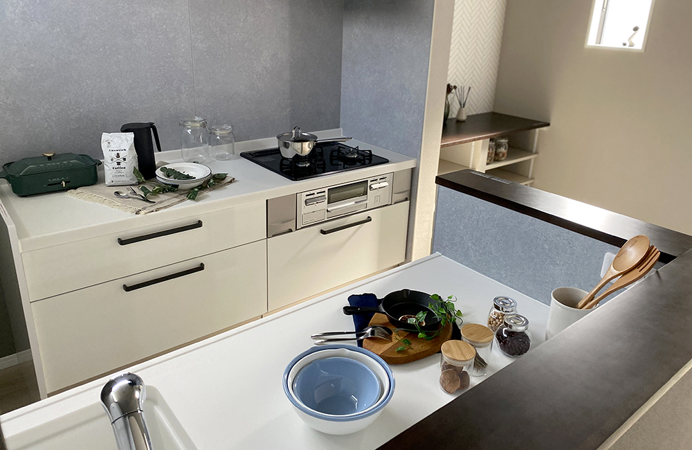 使い勝手の良いⅡ型キッチンを採用しました。お料理中にサッと振り返るだけで、シンクとコンロの両方を使うことのできる、セパレートキッチンです。2人同時に、洗い物と調理が分担できるレイアウトなので、ご夫婦やお子様に手伝ってもらって、家族みんなで楽しく料理ができます。キッチン横にダイニングテーブルを並べれば、食事の準備や後片付けもスムーズです。