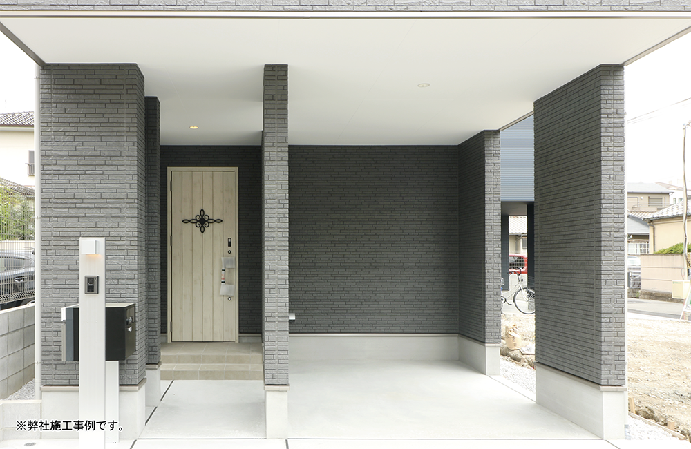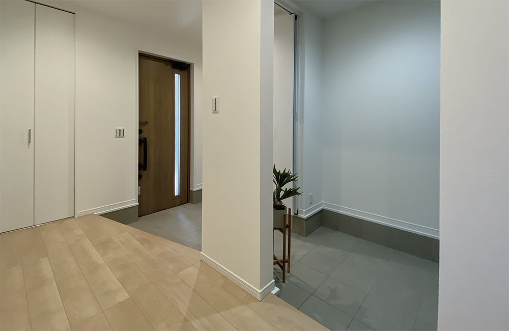 お客様用とご家族用を分けた2WAY仕様の玄関。お家の顔となるお客様用の玄関には、観葉植物など飾ってオシャレに演出♪ご家族用の玄関には、シューズクロークを設け、ベビーカーやアウトドアグッズなどを置ける、ゆとりのスペースです。急な来客時に散らかっていても、サッと隠せる扉などがあるので、いつでもスッキリと見せれます。