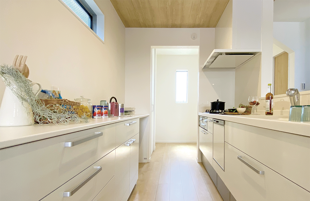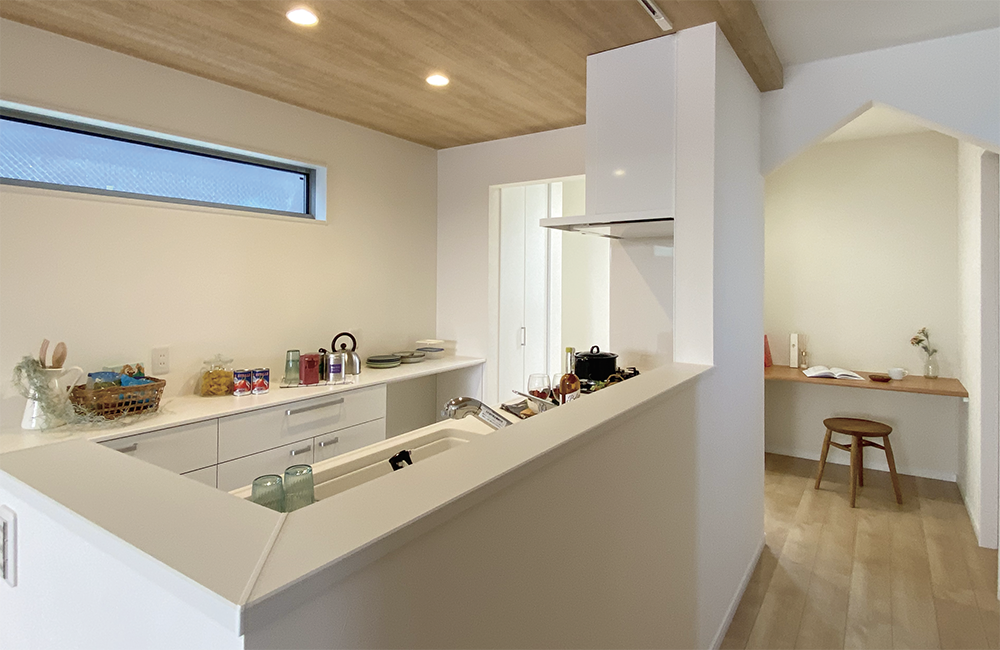 ぐるっと回遊できる家事動線を考えたキッチン廻り。窓のある明るい家事コーナーには、造作カウンターを設けました。奥様が家事の合間にほっとひと息ついて、お茶や趣味などを楽しめるスペースです。キッチンからも目が届くので、子どものスタディスペースとしても使えます。また家事コーナーに、冷蔵庫やパントリーをまとめた事で、買い物から帰ってきた時など、食料品の整理もしやすく、スムーズに使えます。