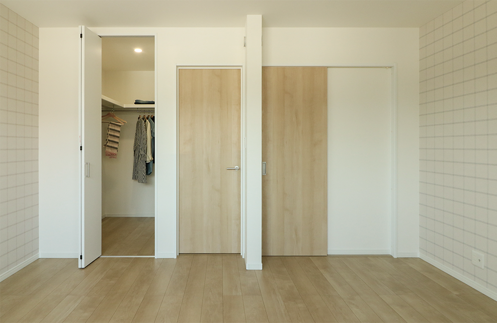 お子様の成長や生活スタイルにあわせて、2つにも分けることができる、ウォークインクローゼットのある9.0帖の部屋を設けました。子どもが小さい頃は、ご家族みんなが一緒に寝られるファミリースペースとして使用できます。子ども達が成長し、それぞれの部屋が必要になった時を想定し、部屋を分ける位置に壁の下地を補強し、ドアやバルコニーの位置も工夫しました。
