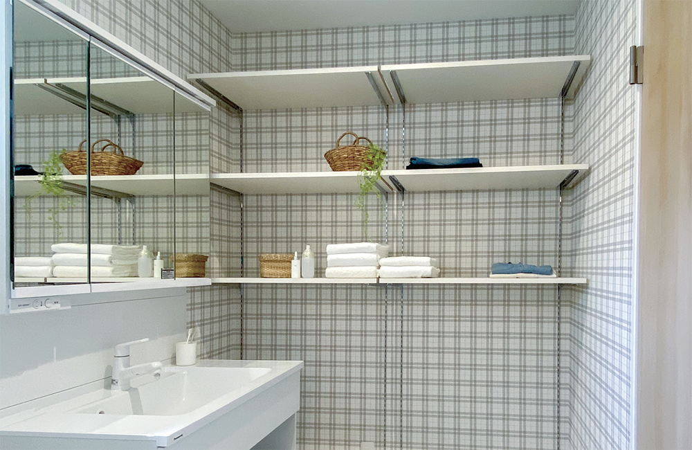 浴室とつながる洗面室には可動棚収納を設けました。フェイスタオル・バスタオルや下着・パジャマなどを置いておけば、お風呂上がりにすぐに体を拭いて、そのまま服も着れるので、湯冷めなどしにくいですね。またシャンプーやボディソープといった、日用品をストックする場所や、スマホやメガネといった小物を置く場所など、用途に合わせて、使いやすい高さに調整できます。