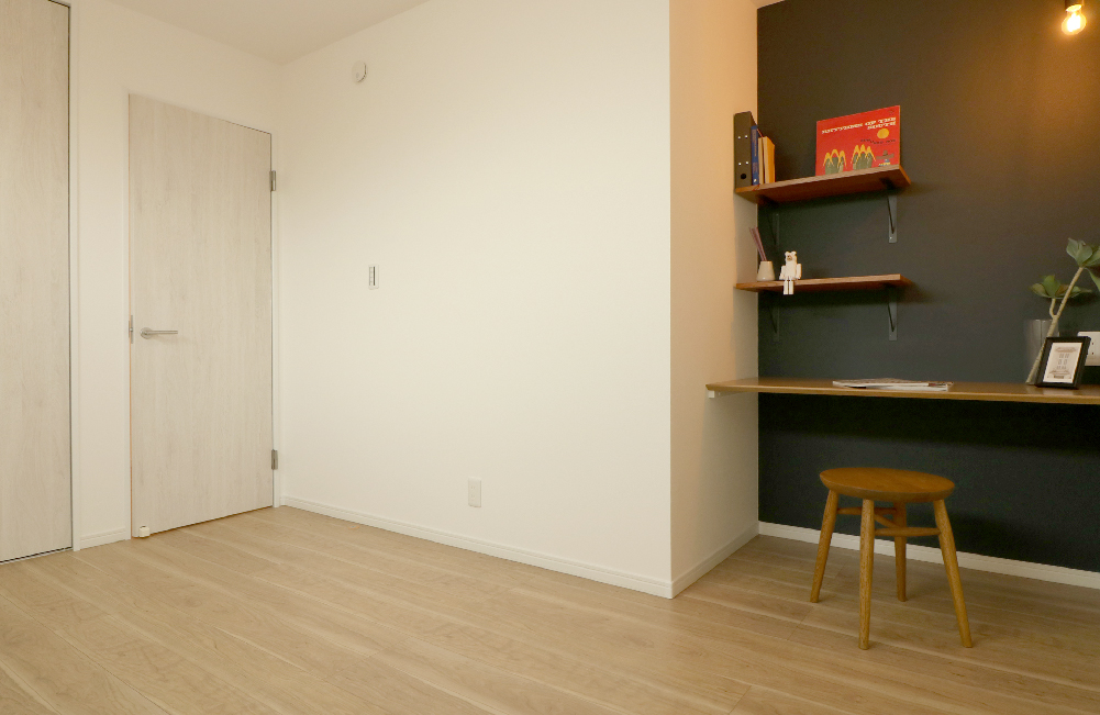 3階の主寝室に、リモートワークや趣味に集中できる、程よい広さのカウンターを設けました。家で仕事をする時など、ご家族と距離を置いて、静かな時間を過ごせます。壁付けの棚は、上部のスペースを有効活用し、小物や書籍・書類を、スッキリと収納できます。またママの外出前のメイクや髪型などを、整えれるドレッサースペースとしてもお使いいただけます。