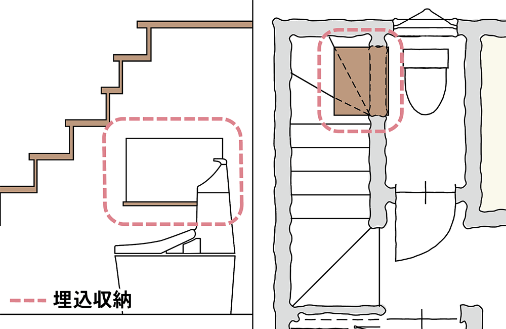 1階の階段下には、トイレ内の埋込収納を設けました。トイレ室内の埋込収納は、階段下のデッドスペースを有効活用し、トイレットペーパーや洗剤・サニタリー用品などを、収納できるスペースです。また便器に座りながらでも、物の出し入れができるので、便利にお使い頂くことができます。