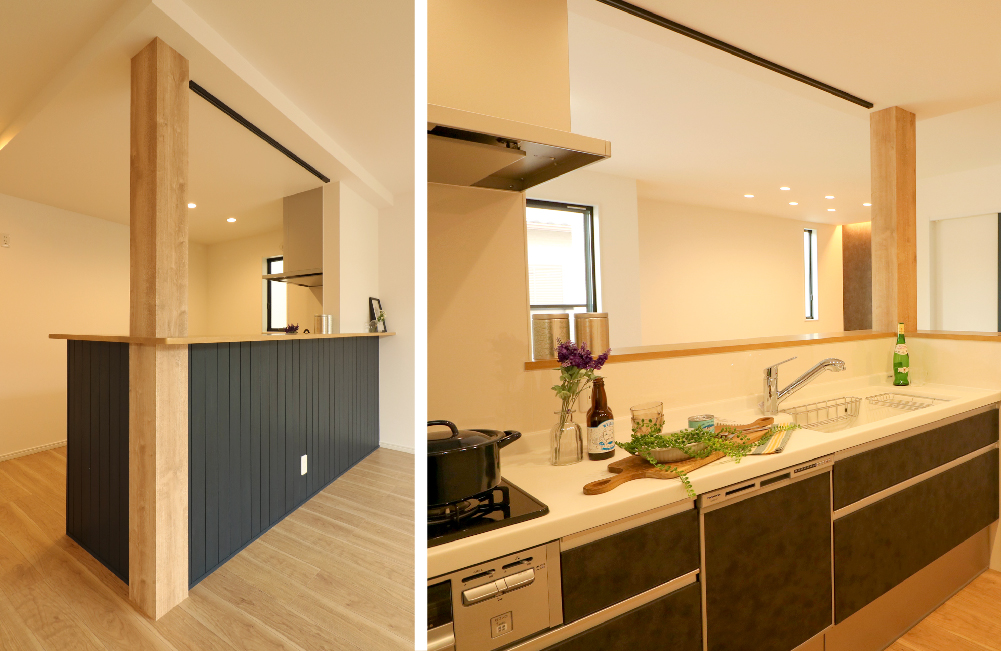 キッチン腰壁には、ネイビーオーク柄の木の板を配し、見た目に楽しいナチュラルビンテージの、テイストを取り入れました。またクラックや節をあえて残した、リアルなオーク柄の造作柱を設けるなど、暮らしを楽しむ空間の、アクセントとなるように仕上げました。