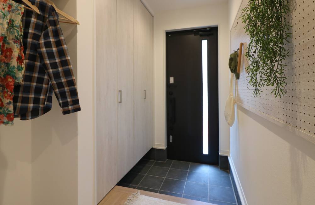 単調になりがちな玄関ホールには、アクセントに有孔ボードを設置しました。お好きな位置にフックを取り付けて、アイテムを飾れる、個性あふれるディスプレイスペースです♪お出かけする時の、鍵や帽子・カバンをかけておいたり、お気に入りのアート作品・観葉植物などを飾って、玄関をオシャレに楽しむ事ができます。