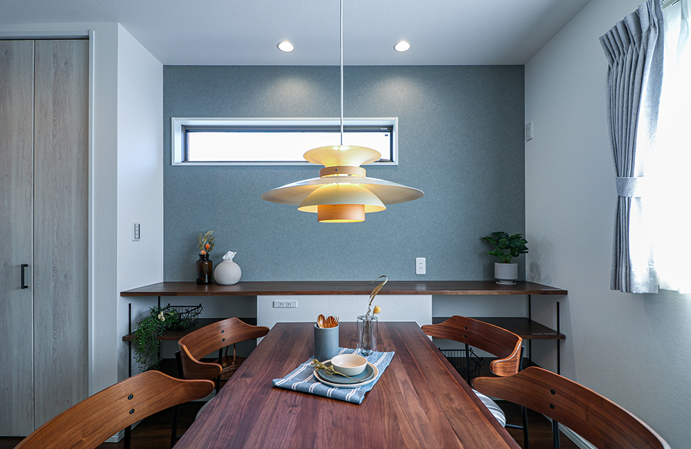 ダイニングの壁には、漆喰のようなアクセントクロスを貼った、インテリアカウンターを設けました。上部の大きな窓からは、明るい光が差し込み、心地良い開放感を感じられます。ダイニングテーブルの高さに合わせた腰壁のコンセントは、たこ焼き器やホットプレートなど調理家電を使う時に、コードを差しやすくスムーズに使えます。