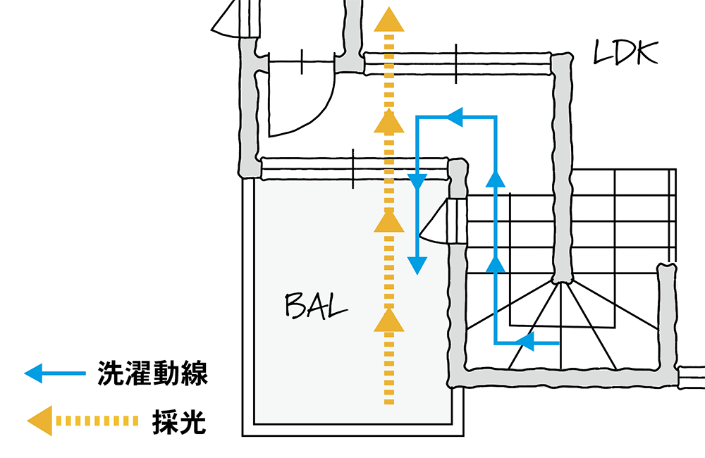 陽あたりの良い2階に、2.5帖のバルコニーを設けました。洗濯物を干す時に1階から階段を上がって、すぐの場所にあり、日々の洗濯動線がスムーズです。またリビングとの間を、半透明のハイドアで仕切ることで、室内空間をより広く見せ、バルコニーから入る光を柔らかくリビングへ通します。