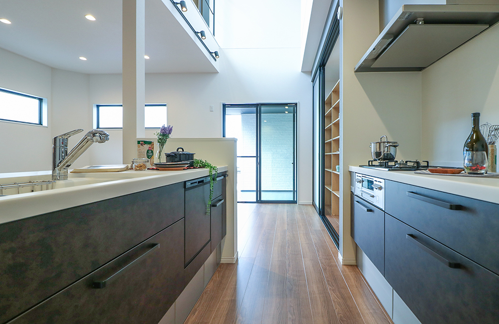 お料理中にサッと振り返るだけで、シンクとコンロの両方を、使えるセパレートキッチン。2人で同時に、洗い物と調理が分担でき、ご家族みんなで楽しく料理もできます。またキッチン横には大容量のシステム収納を設けました。急な来客時でも、サッと扉を閉めれば生活感を出さずに、スッキリと見せることができます。