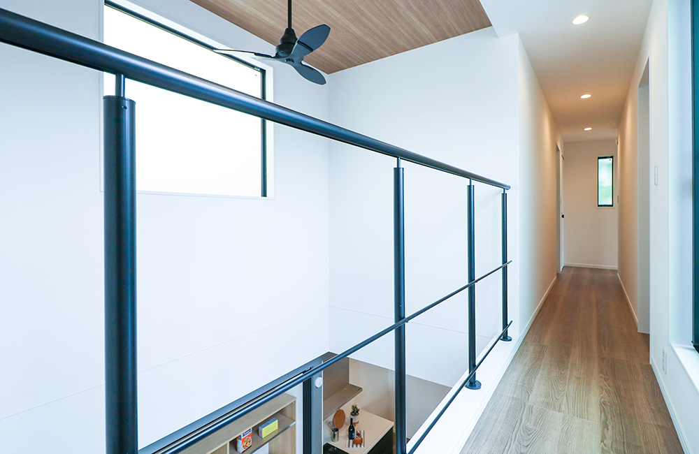 吹抜けに面する2階の廊下には、スタイリッシュなアルミ手すりを設けました。2階バルコニーからの陽光を、1階のLDKへ届けてくれます。また料理をしながら、2階で子供が遊んでいる気配を感じたり、「ご飯できたよ〜!」と2階の家族に伝えたりと、自然と家族のつながりが深まるように工夫しました。