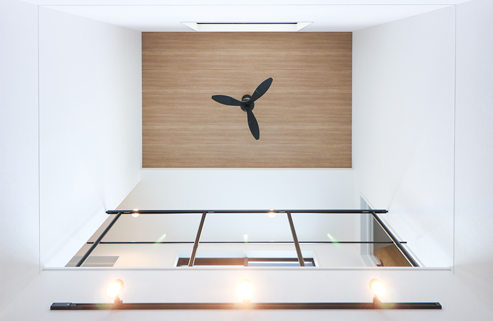 ダイニング上部には吹抜けを設けました。北向きながら、2階バルコニーの南窓から陽光を取り込む、明るく開放的なLDKとなっています。空間を演出するアクセントに、スポットライトや、シーリングファンも取り入れました。見た目にも楽しく、オシャレで落ち着いた時間をお過ごし頂けます。