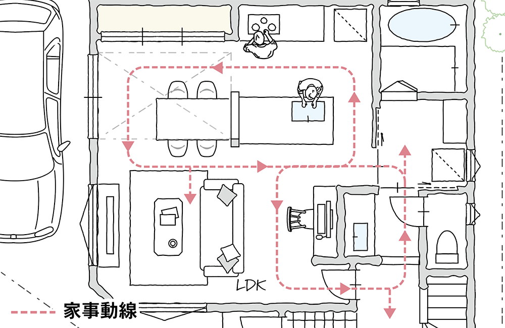 セパレートキッチンと独立洗面室を起点とした回遊できる、つながりのある家事動線です。料理をしながら洗濯などの家事が同時にできる「ながら家事」を行うことができ、時間を有効に使えます。浮いた時間で家事コーナーでPC作業をしたり、ソファに座って、TVを観ながらコーヒーでも飲めば、ゆっくりと一息つけますね。