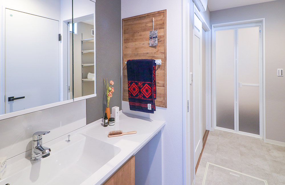 玄関のすぐ近くにある洗面台は、帰宅時の手洗い習慣が自然と身に付きます。また脱衣所と分けているので、誰かが入浴中でも、気兼ねなく同時に使うことができます。壁に設けたマグネットボードは、タオルや小物を好きな位置に配置できます。ワイドな洗面カウンターは、2人同時に並んで使えて、歯みがきや身支度ができ、朝のあわただしい時間に余裕をもつことができます。