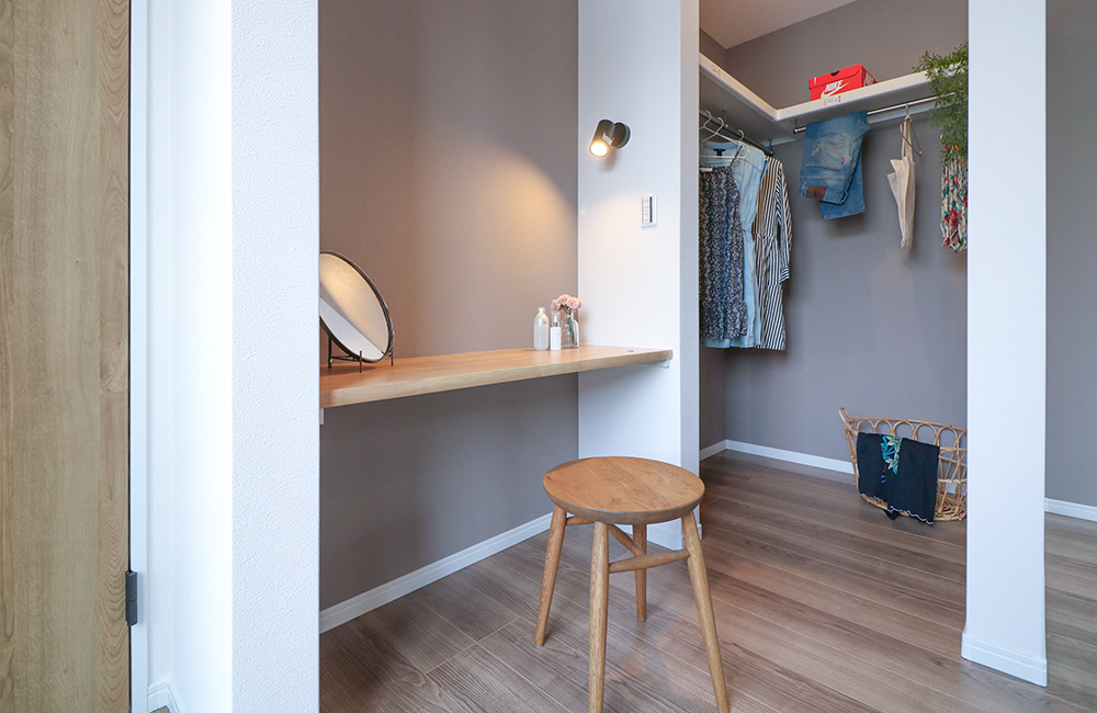 垂れ壁でゆるりと区切ったウォークインクローゼット内には、ママにうれしいドレッサースペースを設けました。外出前のスタイルを決めながらメイクや髪を整えられる空間は、朝の身支度をワンコーナーでシンプルに済ますことができます。
