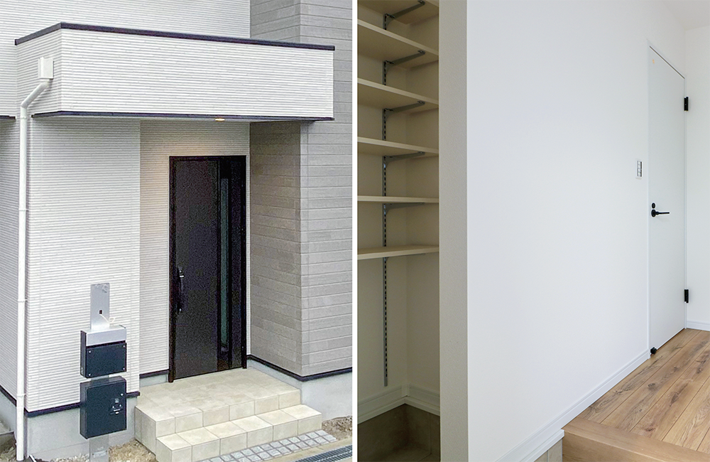 玄関ポーチの上に、奥行のある陸屋根を設けました。雨の日でも濡れることなく、落ち着いて傘の準備や、玄関の鍵の開閉ができます。玄関のシューズクローゼットは、あえて扉を設けず垂れ壁で隔てることで、ベビーカーなどスムーズに収納できるスペースになっています。