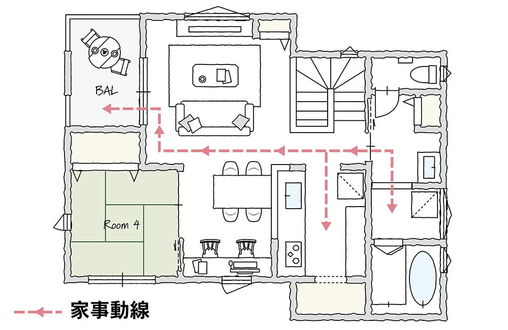 毎日のお料理や洗濯といった家事がラクになるように、キッチン・洗濯室・バルコニーを2階のワンフロアーにまとめました。洗濯物を持って階段を上り下りする事のない、ストレスフリーな家事動線です。またお料理や洗い物をしながらの「ながら家事」で、家事に費やす時間を短縮し、自分の時間を楽しむことができます。