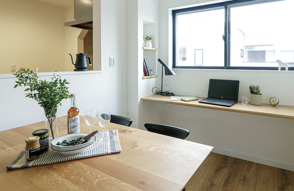 目の前の大きな窓から、光が差し込む明るいスタディカウンター。子どもがお絵描きや、勉強している時でも、キッチンやリビングから目が届くので安心です。またリモートワークのPCコーナーや、洗濯物のアイロンがけなど、ご家族みんなでフレキシブルにお使い頂けます。