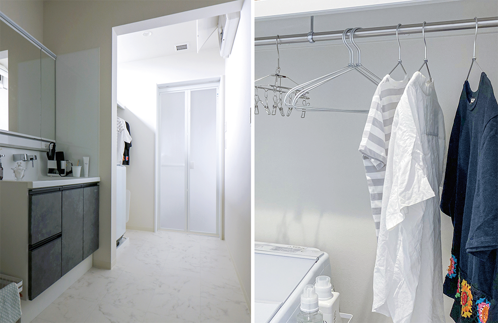 洗面室と脱衣室の間に、カーテンを設置できる垂れ壁を設けました。お風呂に入る時に、カーテンを閉めれば、他の人が洗面室やトイレを、気兼ねなく使えます。洗濯機上の固定棚には、洗剤・柔軟剤など、洗濯機周りのアイテムを置いておく事ができます。ハンガーパイプは、浴室乾燥機で洗濯物を干す際のハンガー類や、バスタオルを掛けられ、便利にお使いいただけます。