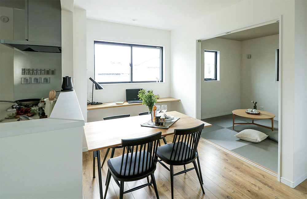 ダイニング横には、オシャレな琉球風畳の4.5帖の和室を設けました。取り込んだ洗濯物を畳んだり、来客時には扉を閉めれば、客間としてお使いいただけます。キッチンからも見える位置にあるので、子どもがおもちゃ遊びやお昼寝をしていても、家事をしながら子供の様子を伺うことができて安心です。