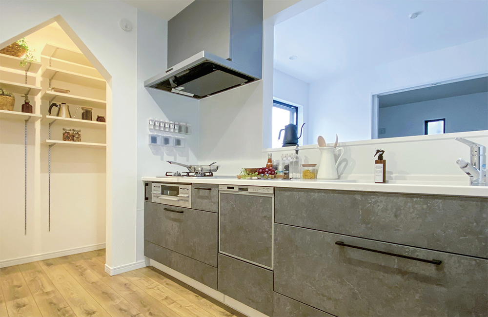 キッチン横のパントリ―。キッチンとの間を三角垂れ壁で、ゆるく仕切ったことで、スムーズに移動ができ、一目でどこに何が置いてあるかが分かり便利です。また食料品のストックや、食器類・調理家電などを置くだけでなく、来客時に人目につけたくない、ゴミの分別ボックスなどもスッキリと収まるスペースです。