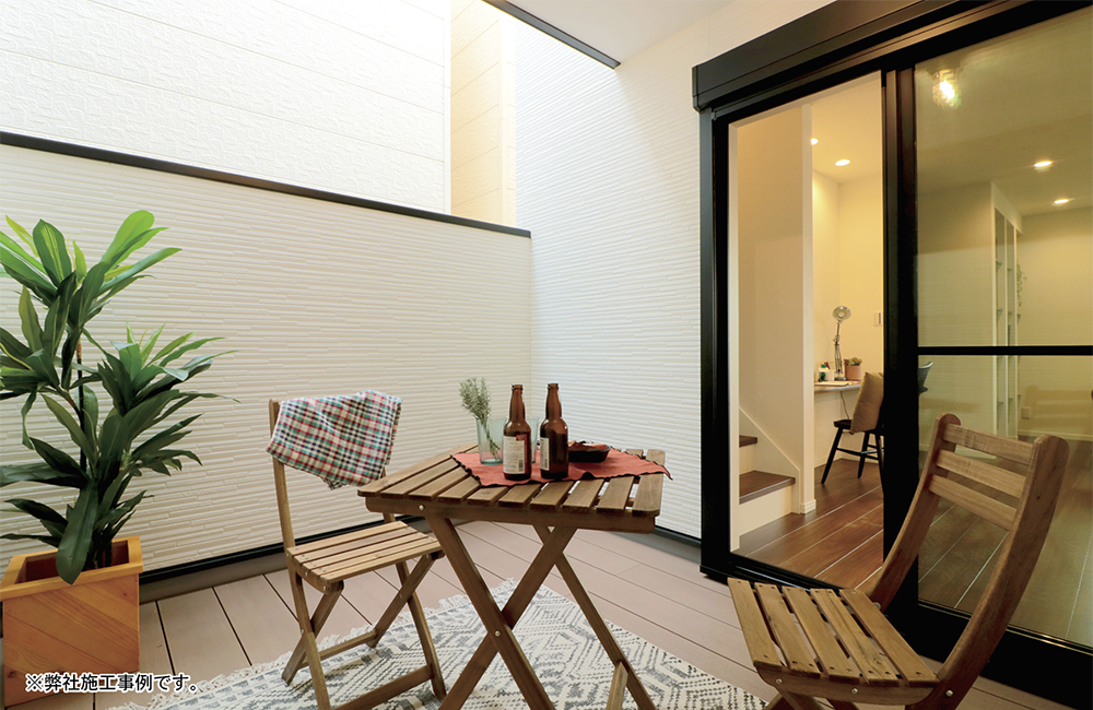 陽当たりの良い南面に面し、明るい光が入る3.0帖の広さのインナーバルコニー。洗濯物を干す以外にも、アウトドアリビングとして使えます。テーブルをセットして食事や読書したり、夏にはキッズプールを出して子供と楽しんだりと、その時の気分や季節に合わせて、気ままに使うことができます。