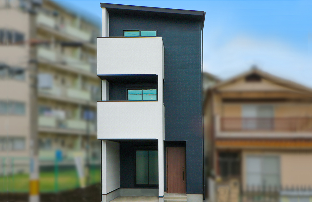 外観はホワイト×ネイビーを組み合わせ、都会的な暮らしにマッチする、爽やかな印象に仕上げました。道路から人目につく面は、見る角度を変えても、スタイリッシュに見えるデザインとなっています。内装の室内ドアなど、外観とカラーテイストを合わせ、統一感のあるまとまったお家です。