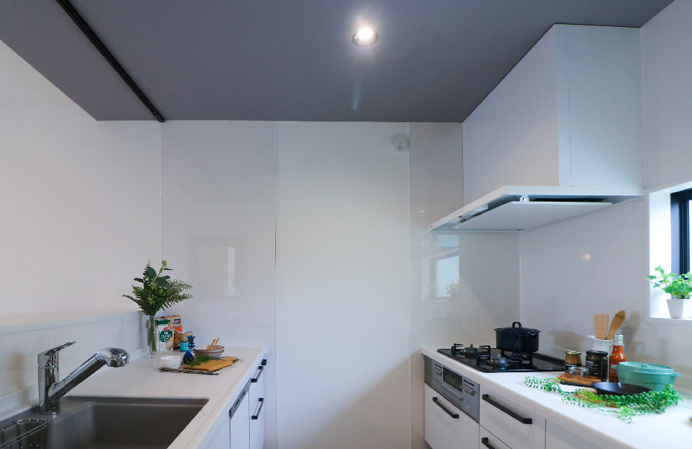 折下げ天井やアクセントクロスで、ゾーニングしたキッチンスペース。シンクとコンロの両方を、振り返るだけで使えるII型キッチンは、洗い物と調理が分担でき、ご家族みんなで楽しく料理もできます。キッチンカウンター下のオープン棚は、お気に入りの雑誌や小物を、おしゃれにディスプレイできます。