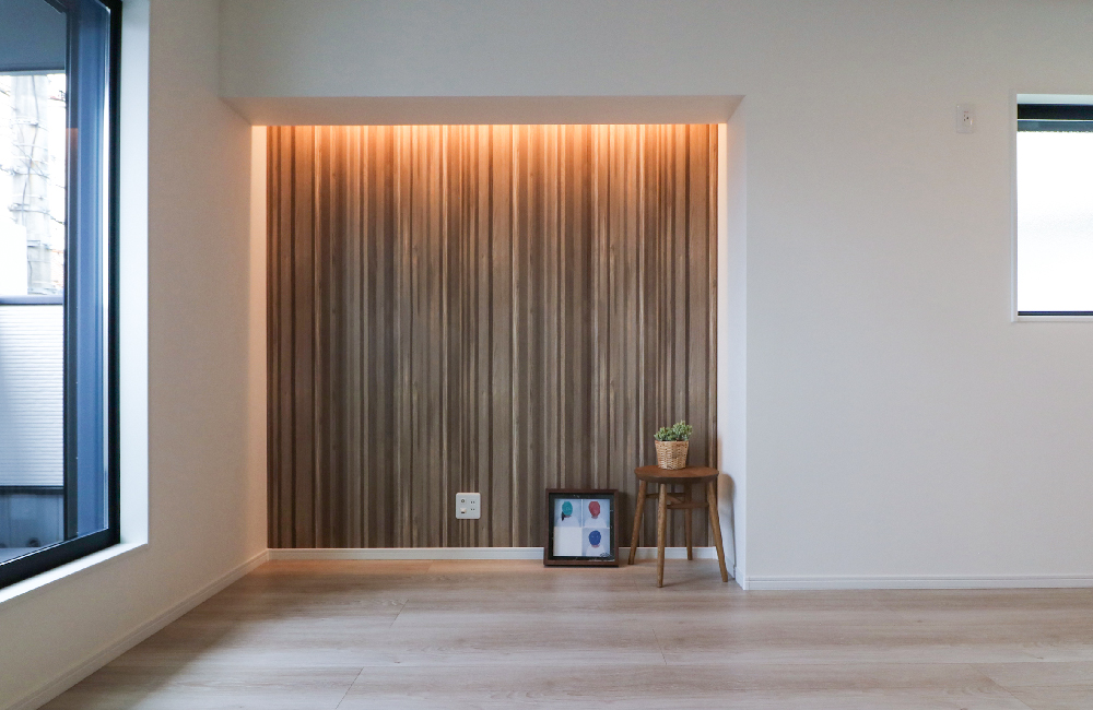 ご家族が自然と集うリビングの一面に、細い木目のストライプ柄が印象的な、アクセントウォールを設けました。天井からのコーニス照明が、アクセントウォールを間接光で優しく照らし、暖かみのある柔らかな光のグラデーションで、ホテルライクなリラックス空間を演出します。