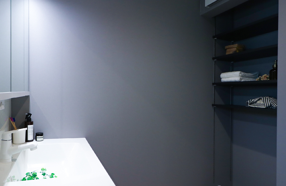 ゆとりのある広さを確保した洗面室には、可動棚収納を備えました。タオルや下着・パジャマを置いておけば、お風呂上がりがスムーズになります。またシャンプーやボディソープなどの、日用品をストックする場所や、スマホやメガネといった小物を置く場所など、用途に合わせて、使いやすい高さに調整できます。
