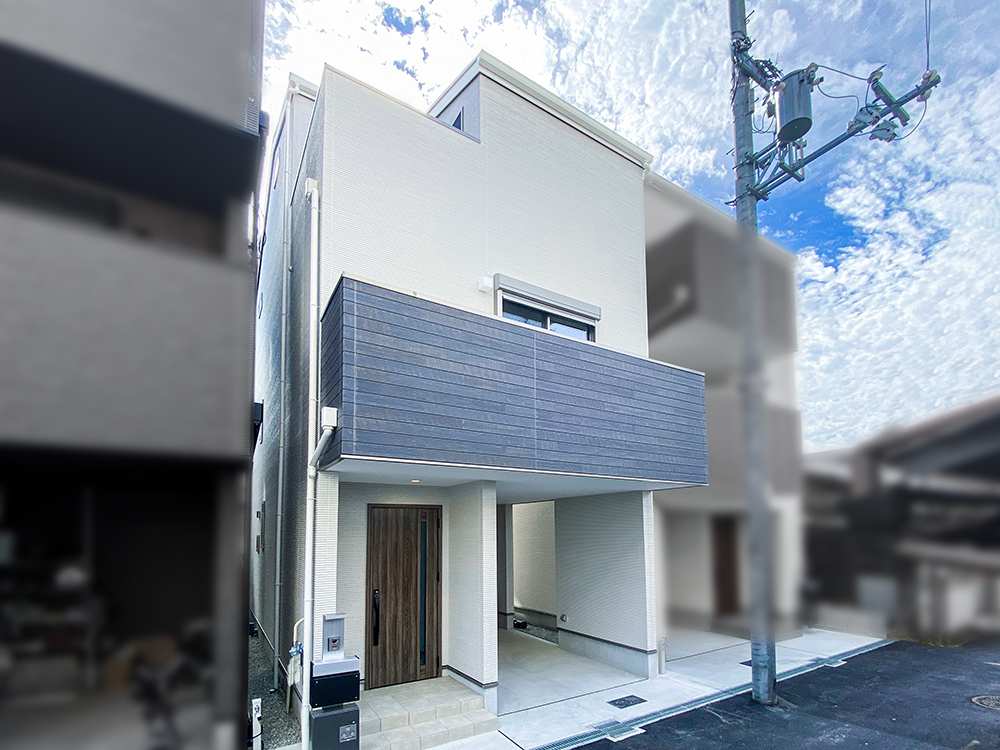 三角屋根のシンプルな外観。正面の窓を減らし、バルコニーの腰壁を高くして、生活感なくおしゃれに。まわりに高い建物もないので、外からの視線を気にせず、のびのび暮らして行けますね。