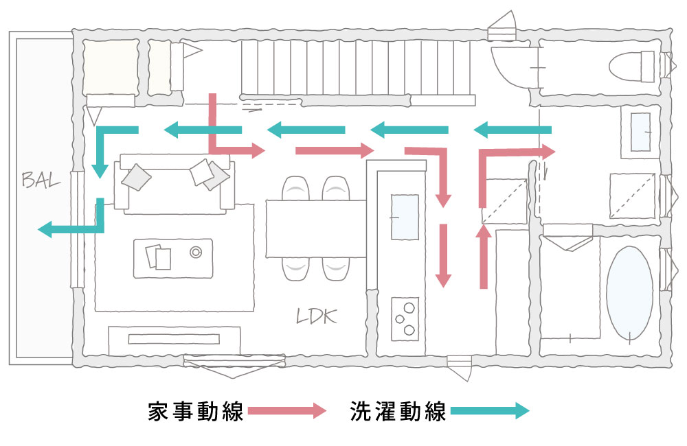 2階に水廻りにまとめた家事ラク動線。キッチン⇔洗面室⇔バルコニーの移動距離が短く、ながら家事がしやすくなっています。帰宅して買ってきた食材や消耗品の収納もしやすく、お料理をしながら、ササッとお洗濯を済ませて、ちょっとした待ち時間にLDKでコーヒーを飲みながら一息つく時間もできちゃいます。洗面室からまっすぐバルコニーに行けるので、洗濯を干したり取り込んだりもラクチンです。