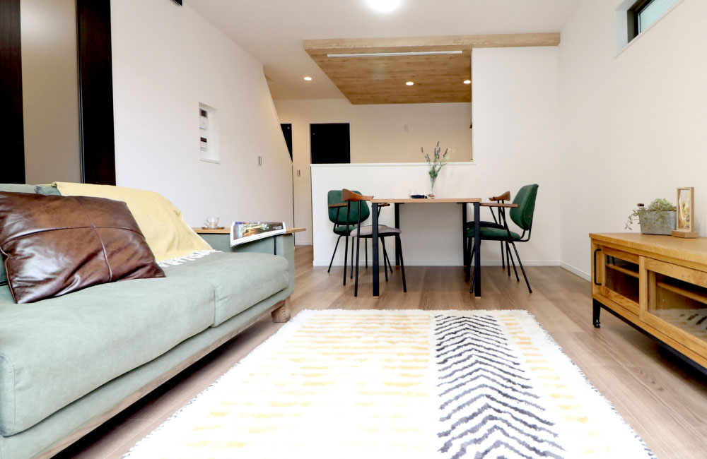 LDKは白を基調に木目やモルタル調のクロスを使い、シンプルでかっこいいテイストに仕上げています。キッチンとダイニングは木目の折り下げ天井でゆるりと仕切り、カウンターの上部にはダクトレールを設置。スポットライトやペンダントライト、植物やスピーカーを吊るして、カフェやお店みたいな演出もたのしめますね。