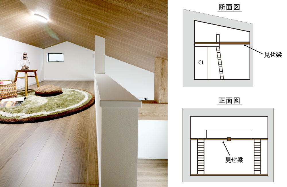 勾配天井になっている3階の子ども部屋にロフトを用意しました。将来間仕切り壁を取付けられるよう梁と束を残し、はしごや収納・エアコンも2つ付けられるようにしています。部屋を分けるまでは、残した見せ梁にブランコやハンモックを取り付けたり、ロフトを子ども用の寝室兼秘密基地にして、下のスペースを広々と使えます。子どもたちの成長やライフスタイルに合わせて、家具で仕切ったり、壁を造ったり、カーテンで仕切ったり、フレキシブルに可変できる空間です。