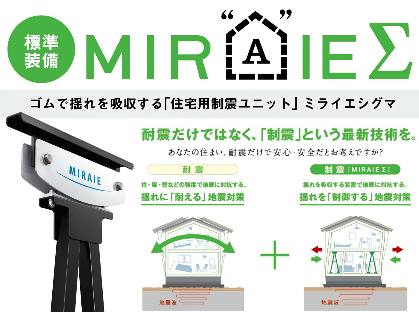ご家族が安心して暮らせるように、住宅用制震ダンパーMIRAIEΣ[ミライエシグマ]を取り入れています。突然の地震や、その後も繰り返し発生する余震の揺れを、効果的に吸収し続けることで、家の損傷を軽減し、補修を最小限にとどめます。90年経過しても性能がほとんど変わらず、メンテナンスの必要もありません。
