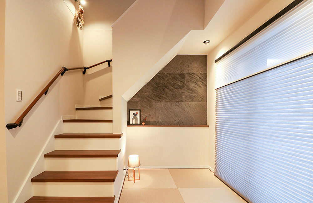 階段下を有効利用した3帖の畳コーナーは、リビングの延長として使えるようフラットにつなげました。ごろんとお昼寝をしたり、お子さまの遊び場としても使えるくつろぎのスペースです。壁面に濃いグレーの天然石のタイルを貼り、和モダンな心地よい空間になりました。ひな壇階段と吹抜けを合わせることで、リビングの解放感と広さをより感じられるようになっています。
