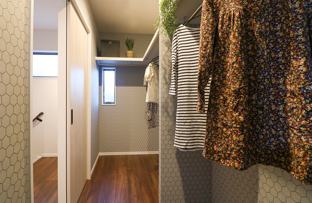 廊下からも、主寝室からも出入りできる約3帖のファミリークローゼットを設けました。窓から風を通し、湿気やカビも防ぎます。玄関やリビングにも片付けやすいように、大容量の隠せる収納を備えているので、いつでもスッキリ暮らすことができます。