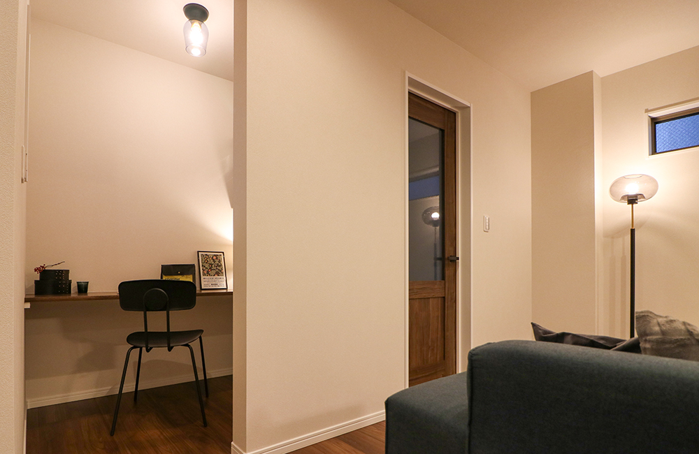 約1.5畳の半個室のスペースは程よく視線を遮られているので、作業に集中できる空間になっています。リビングから見えにくい位置に、書類や小物、プリンターなどのOA機器の置き場所としても最適な可動棚を備えました。リモートワークだけでなく、手作りのアクセサリーを制作したり、奥様の趣味部屋としても。