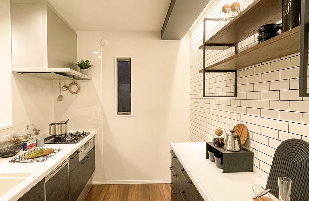 ブラック×ホワイトでクールなイメージのキッチン。リビングとのつながりや開放感を重視した対面型になっています。ブラックのクロスを施した折り下げ天井には、間接照明をほどこしLDKのアクセントとして空間を彩ります。カップボードの上には無垢の木を使用したシンプルでスタイリッシュな棚を備えました。お気に入りの茶器やコーヒーセットをディスプレイして「みせる・飾る」を愉しめます。