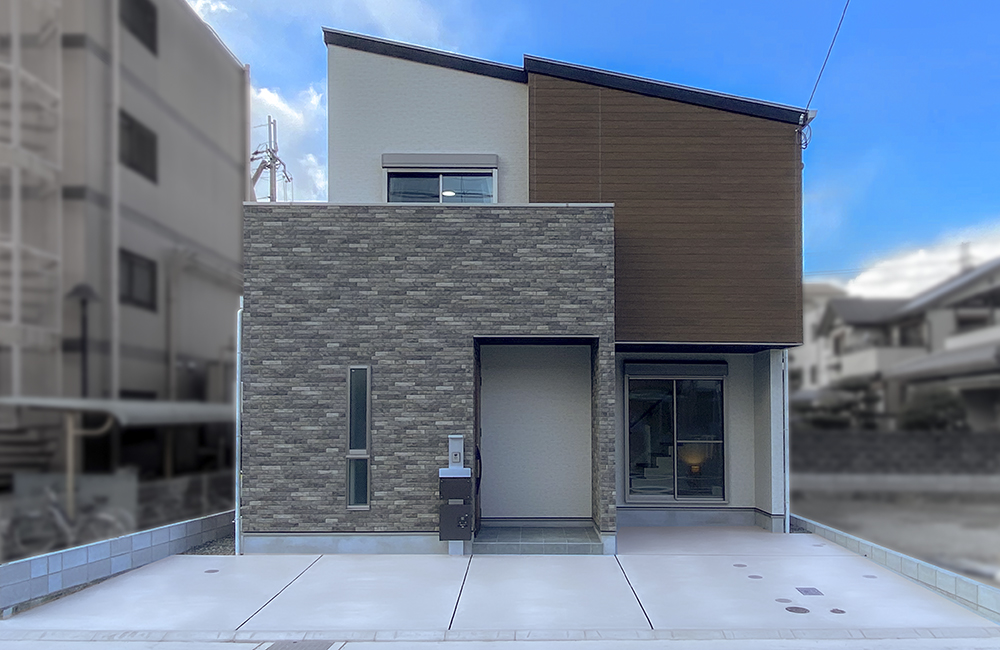 マンションや施設が隣接している土地条件の為、吹抜けや窓の位置を高くすることで周囲からの視線を遮りながら、光と風を取り入れる工夫を凝らしました。玄関は車通りや道路からの視線にも配慮し、道路から距離をとれる横入を採用。外観にも木目や石目柄を取り入れ素材感を際立たせ、目を引くデザインを計画しました。