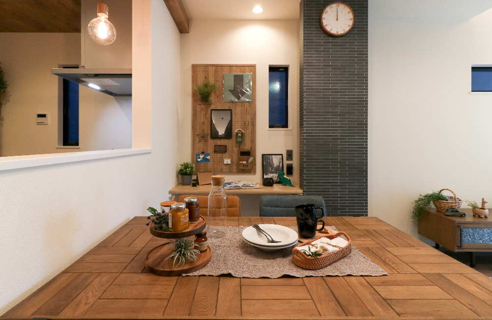 ダイニングの横に、スタディカウンターを設けています。趣味や仕事をしながらお子さまの様子を見たり、お鍋の様子を見ながら書類の整理をしたり。お子さまのオンライン授業やオンラインレッスン、リモートワークにも便利なスペースです。壁面に取付けた有孔ボードには、お気に入りの小物を飾り、よく使うものをおしゃれにレイアウトすれば、リビングテーブルやダイニングテーブルもいつでもスッキリした状態にしておけますね。