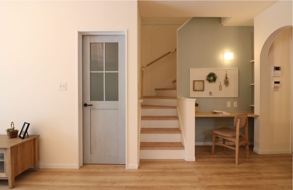 少しシャビーであたたかみのある色いと素材を集めました。やさしい色合いと木の風合いで、毎日を心地よく過ごせます。室内窓やR垂れ壁、チェッカーガラスや折り上げ天井など、デザインにこだわった内装は、住むほどに愛着を持っていただけます。