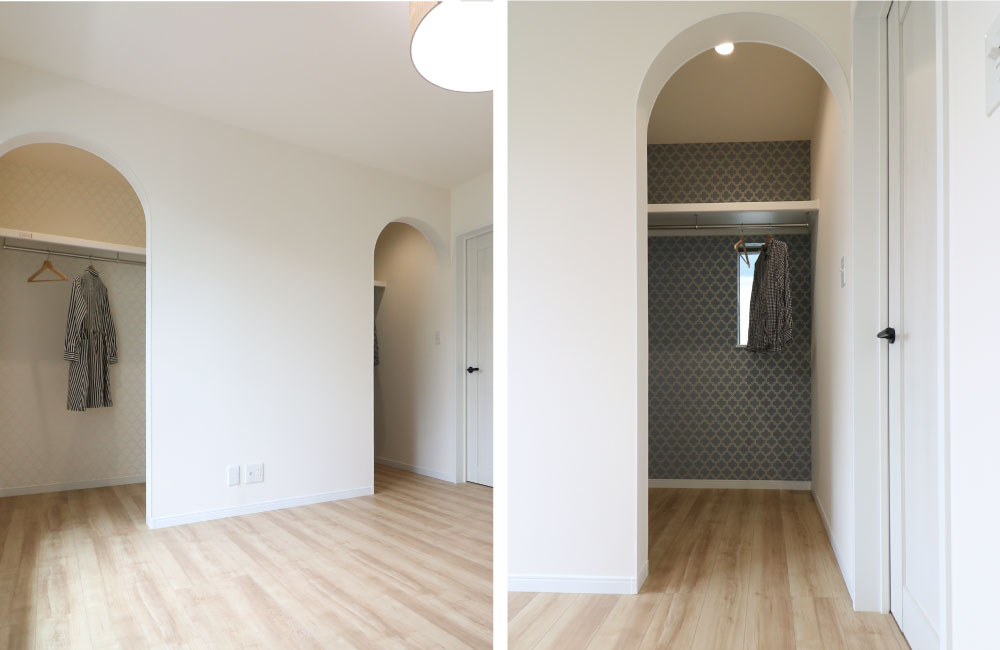1階脱衣所の横にウォークインクローゼットを設けました。浴室乾燥機を使えば、一歩で洗濯→収納を完結することができます。パジャマや子ども服・下着にタオルなど、お風呂上がりに使うものや洗う頻度が多いものを置いておけば、毎日の家事がラクにすみます。入口のR垂れ壁やヘリンボーンの床のおしゃれな空間は、めんどうな洗濯の時間も楽しい時間に変えてくれるはずです。