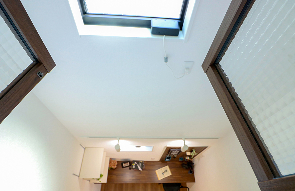 3階の南西側の洋室には、吹抜けとつながる、両開きのおしゃれなチェッカーガラスの内窓を設置し、2階のLDKに居るご家族と、コミュニケーションをスムーズに取る事ができます。吹抜け上部の窓は、電動で開閉できるので、空気の入れ替えもラクにでき、気候の良い日には家中に心地良い風を通します。